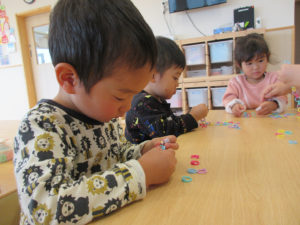 2018年10月17日 / 最終更新日 : 2018年10月18日 admin 集中!! 2才クラスの子どもたちが指先に大集中で作業中です。 一つづつ丁寧にチェーンしていく作業の様子は、何かの研究室スタッフか職人の工房か。…というくらいの集中力ですよ。がんばれ!!